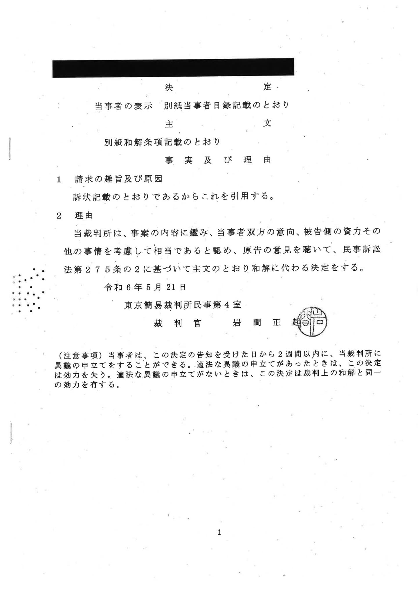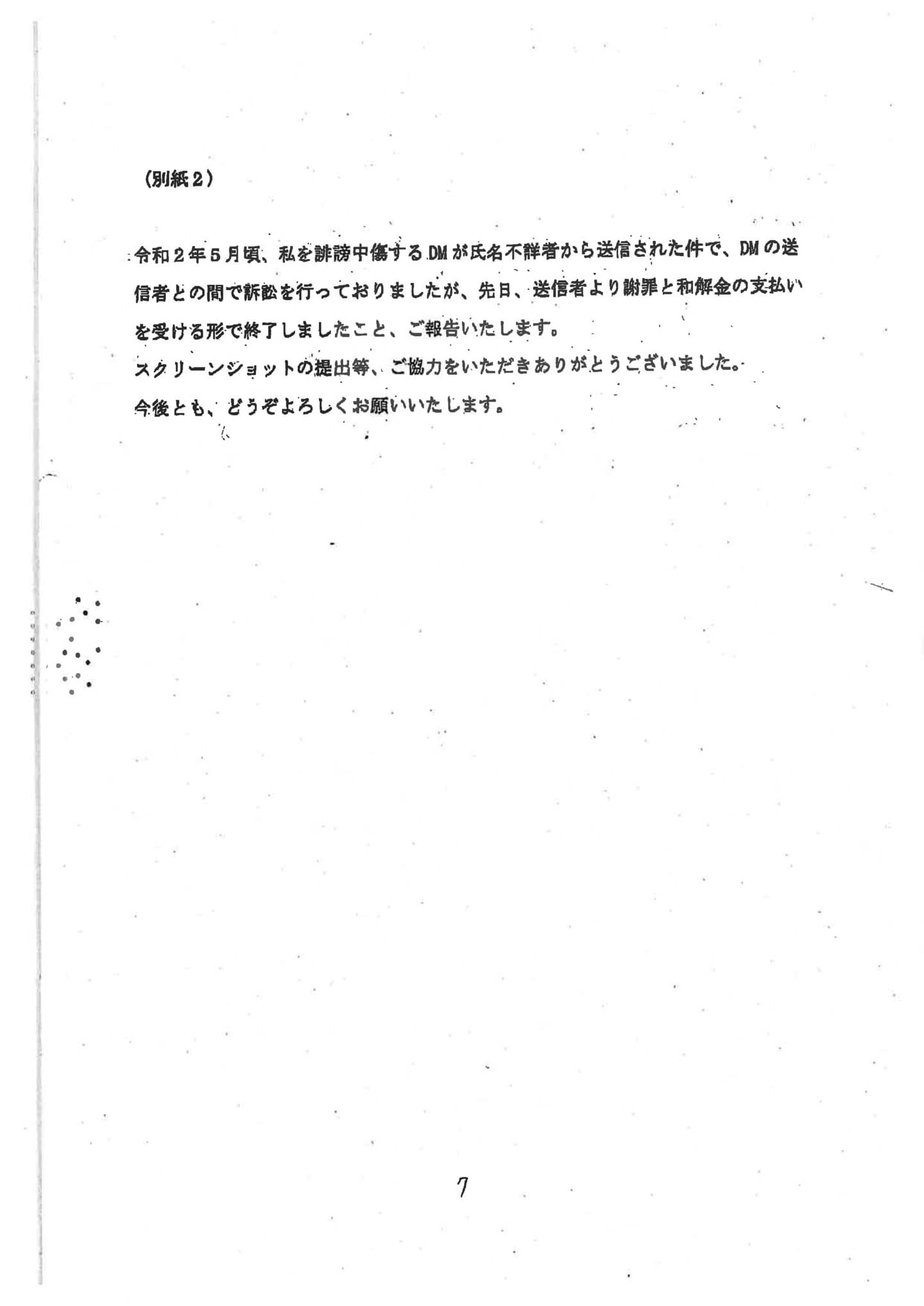 令和2年5月頃、白百合慶祐を誹謗中傷するDMが複数人に送付された件で、DMの送信者との間で訴訟を行っておりましたが、添付画像のとおり、送信者より謝罪と和解金の支払いを受ける形で終了しました。